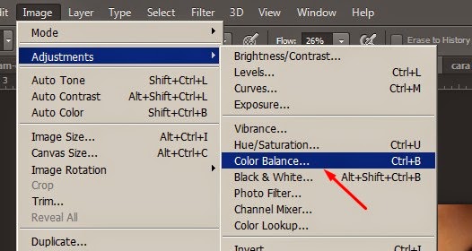 cara selanjutnya Menggunakan Color Balance . disini kita akan Mengatur warna foto asli model . baik caranya Menu Image =>Adjustments =>Color Balance